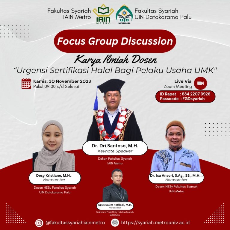 Kamis, 30 November 2023, Fakultas Syariah, Institut Agama Islam Negeri (IAIN) Metro, Mengadakan kegiatan Focus Group Discussion (FGD) secara via zoom meeting dengan tema “Urgensi Sertifikasi Halal Bagi Pelaku Usaha UMK”. Kegiatan ini dihadari Dekan Fakultas Syariah IAIN Metro, Dr.…