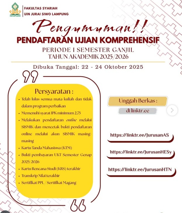 PENGUMUMAN: Pendaftaran Ujian Komprehensif Fakultas Syariah UIN JUSILA (Periode I Ganjil 2025/2026)