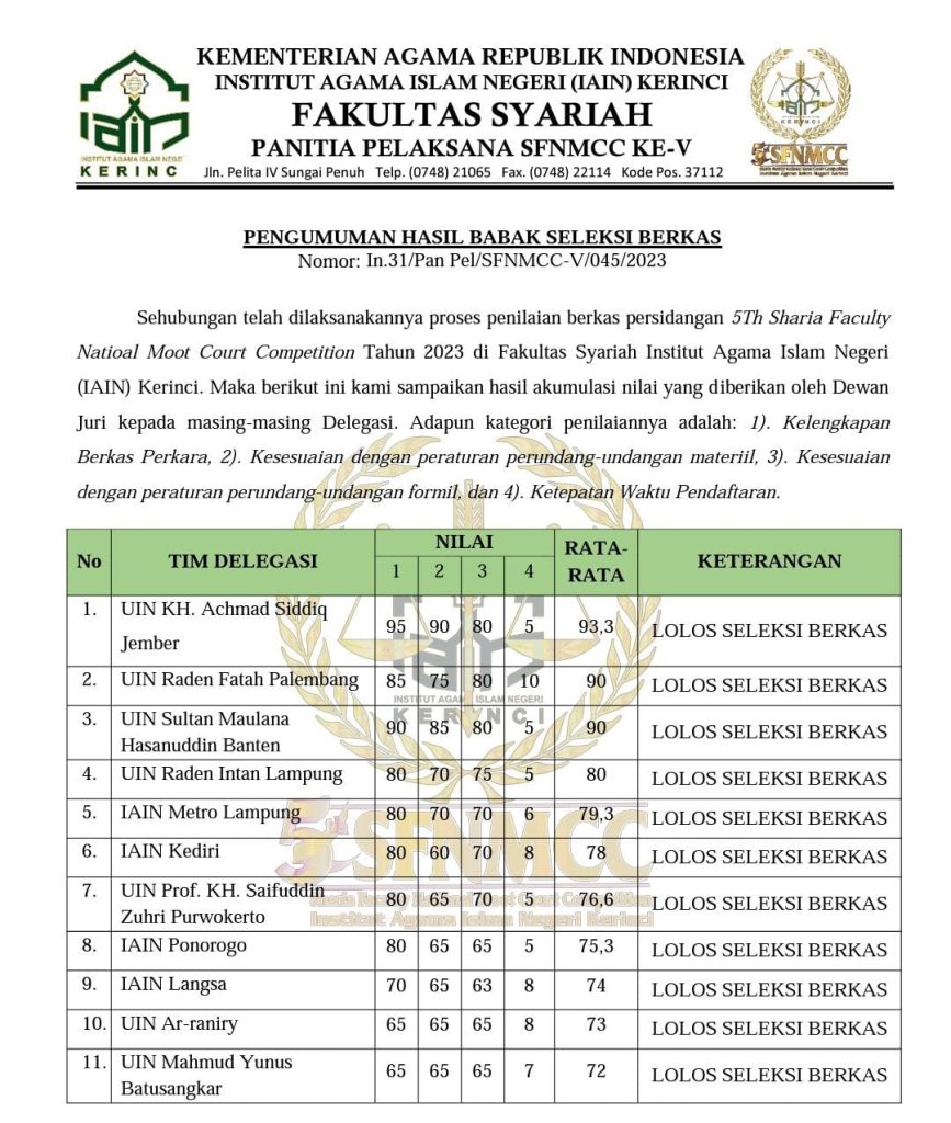 Kegiatan perlombaan ini ada beberapa tahap seleksi yaitu pemberkasan, semi final dan final. Awal dari tahapan ini Fakultas Syariah IAIN Metro telah mengirimkan berkas untuk diseleksi oleh panitia, pada tanggal 06 september 2023 telah dikeluarkan Pengumuman hasil seleksi berkas berdasarkan Nomor : In.31/Pan Pel/SFNMCC-V/045/2023. Seleksi berkas ini terdapat 11 Perguruan Tinggi Agama Islam Negeri yang Lulus seleksi berkas. Alhamdulillah IAIN Metro mendapat peringkat ke 5 (lima). Yang disampaikan pembina oleh Nety Hermawati, SH, MA, MH.