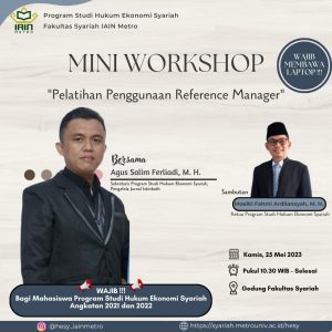 Program Studi Hukum Ekonomi Syari’ah menyelenggarakan Kegiatan MINI WORKSHOP “Pelatihan Reference Manager” bagi mahasiswa terkhusus Angkatan 2021 dan 2022. Kegiatan ini bertujuan untuk memberikan pemahaman tentang pentingnya Reference Manager dalam sebuah Karya Tulis Ilmiah dan skill penggunaannya bagi mahasiswa.