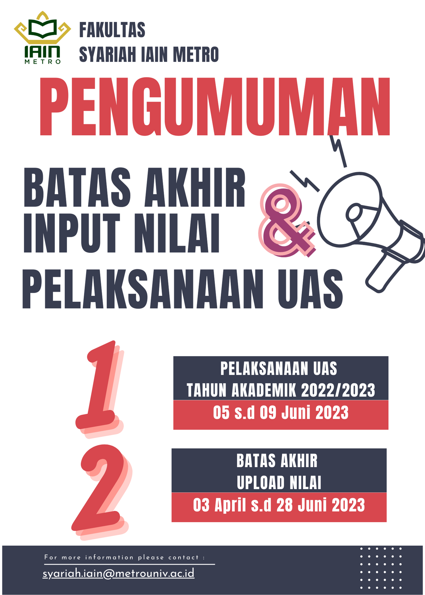 Berdasarkan edaran tentang pelaksanaan Ujian Akhir Semester pada kalender akademik Nomor 158 Tahun 2022,dengan ini kami sampaikan kepada Bapak/Ibu dosen Fakultas Syariah bahwasanya pelaksanaan Ujian Akhir Semester (UAS) Fakultas Syariah Tahun Akademik 2022/2023,di mulai pada tanggal 05-09 Juni 2023. Untuk Berita Acara dan Daftar Hadir UAS dapat diunduh pada link https://rb.gy/ww0dy serta dapat di kirim kembali Berita Acara dan Daftar Hadir UAS dan Soal UAS setelah melaksanakan UAS dalam bentuk PDF pada link https://rb.gy/lgywt
