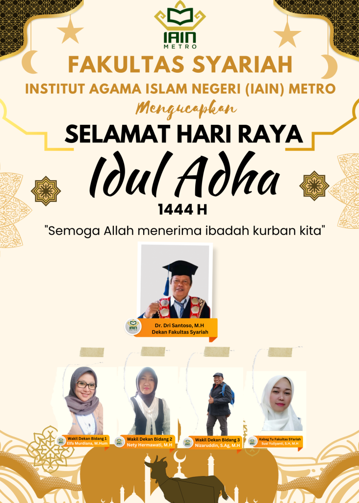 Selamat Idul Adha 1444 Hadminwebsyariah29/06/2023Berita Keluarga besar Fakultas Syariah IAIN Metro mengucapkan Hari Raya IdulAdha 10 Zulhijah 1440 H. Semoga Allah senantiasa melimpahkan ampunandan berkahnya kepada kita semua dan semoga Allah menerima ibadah kurban kita
